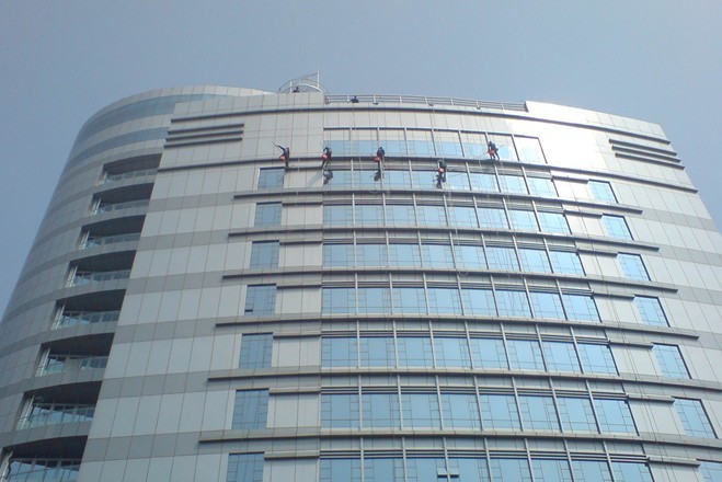 高空清洗的一種,是一種非常危險的保潔施工項目,外墻清洗不僅要做到清洗物的干凈整潔,更重要的是要確保高空清洗技術人員的人身安全。這就要求保潔公司的施工人員有著非常豐富的高空清洗操作經驗,并有良好的管理團隊和過硬的只我安全保護措施。本公司從這些方面著手首先解決了施工工具的安全性,采用雙保險的跳板清洗方式,由專人負責現場施工,責任到人,嚴厲執行施工安全要求,在上百次的外墻清洗施工中無任何安全事故!成都清洗、成都清潔公司。